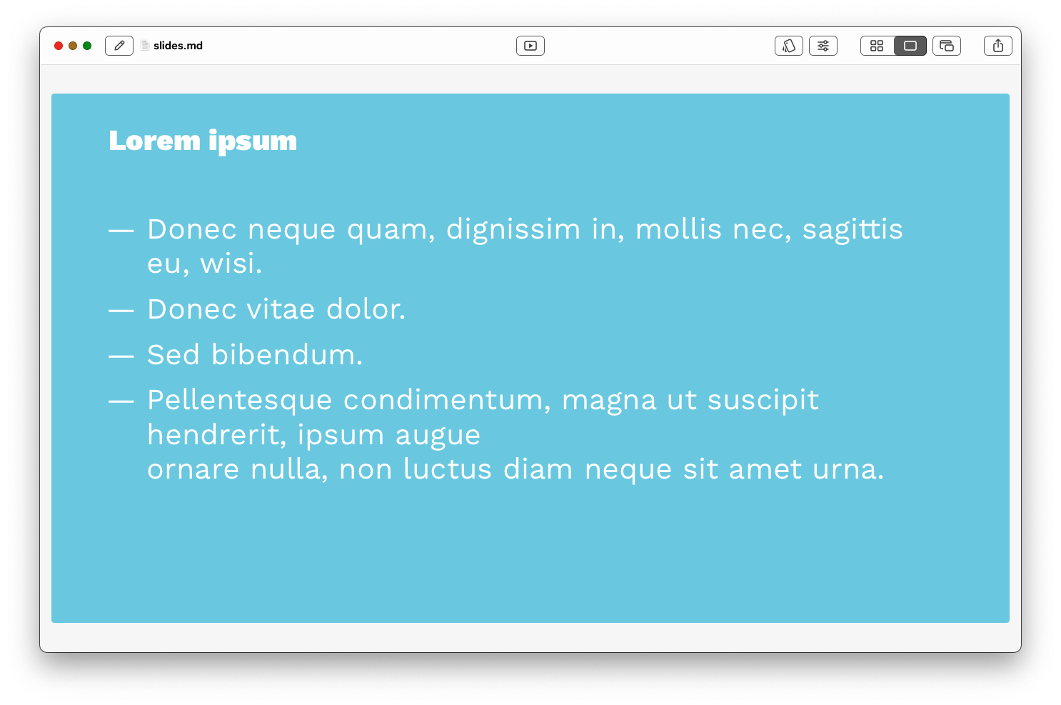 Since we didn’t specify any further options, you get the respective defaults of Deckset and LaTeX (Deckset will just pick a random theme). Typically you’ll want to adjust settings, but this goes to show that you get reasonable results even without any configuration.